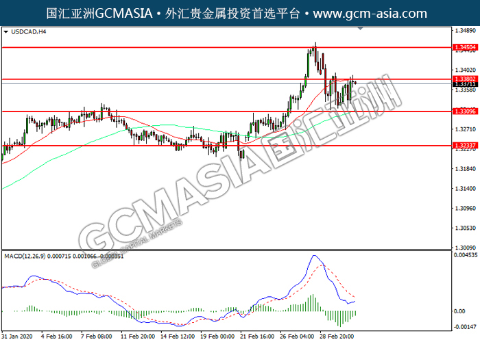 USDCAD, H4: 美加震荡上行,目前测试前期压力。MACD空头动能略减,若突破继续看多为主。上方关注1.3380压力和1.3450压力,下方关注1.3310支撑和1.3235支撑。