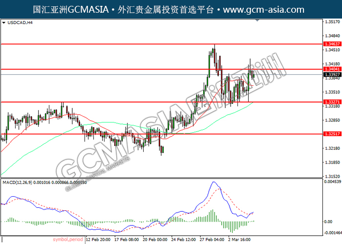 USDCAD, H4: 美加低位反弹,目前测试前期压力。MACD已形成金叉,动能转强,若突破可关注多头为主。上方关注1.3405压力和1.3465压力,下方关注1.3325支撑和1.3250支撑。