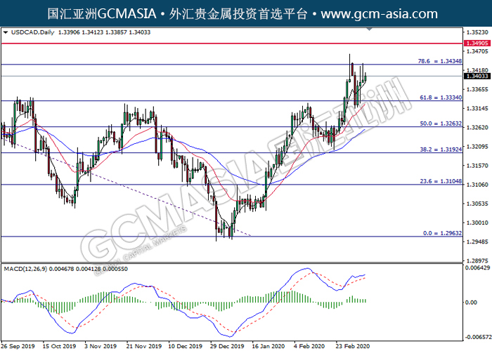 USDCAD, Daily: 美加低位反弹。MACD多头动能偏强,短期可关注多头为主。上方关注1.3435压力和1.3490压力,下方关注1.3335支撑和1.3265支撑。