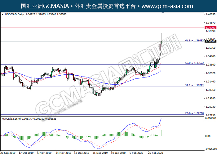 USDCAD, Daily: 美加开高后走高,目前测试压力位。MACD多头动能略增,若突破可关注多头为主。上方关注1.3650压力和1.3830压力,下方关注1.3360支撑和1.3075支撑。