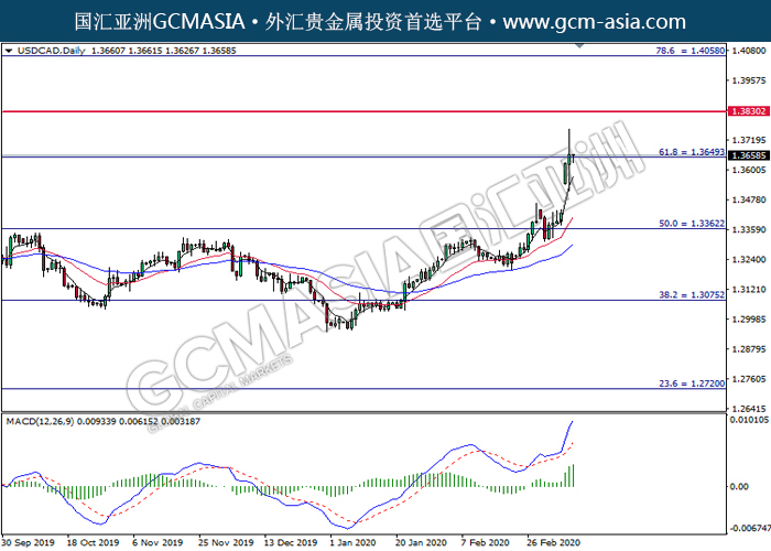 USDCAD, Daily: 美加突破后持续上行。MACD多头动能略增,短期可持续关注多头为主。上方关注1.3830压力和1.4060压力,下方关注1.3650支撑和1.3360支撑。