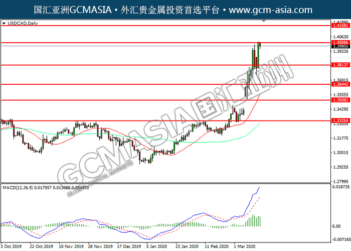 USDCAD, Daily: 美加多头排列,目前测试前期压力。然而,MACD多头动能略减,短期可关注技术性回调。上方关注1.4010压力和1.4160压力,下方关注1.3815支撑和1.3645支撑。