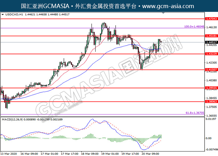 20200323 USDCAD by skylow | Mar 23, 2020 | 美元兑加元 | 0 comments GCMAsia - USDCAD USDCAD 2020-03-23 USDCAD,H1:美加高位承压后回落。MACD多头动能有所略减,短期关注空头为主。上方关注1.4520压力和1.4605压力,下方关注1.4325支撑和1.4150支撑。