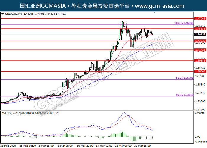 20200325 USDCAD by keyk | Mar 25, 2020 | 美元兑加元 | 0 comments GCMAsia - USDCAD USDCAD 2020-03-25 USDCAD,H4:美加高位承压后回落。MACD空头动能偏强,短期关注空头为主。上方关注1.4535压力和1.4605压力,下方关注1.4325支撑和1.4175支撑。