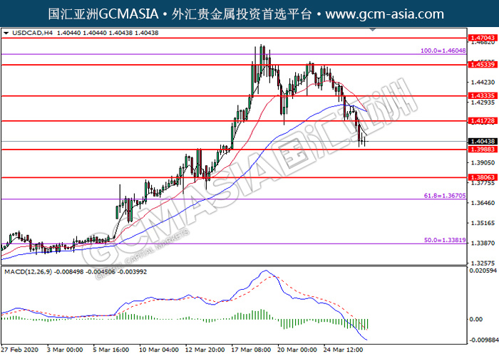 20200327 USDCAD by skylow | Mar 27, 2020 | 美元兑加元 | 0 comments GCMAsia - USDCAD USDCAD 2020-03-27 USDCAD,H4:美加突破后持续下行。MACD空头动能偏强,短期可持续关注空头为主。上方关注1.4175压力和1.4335压力,下方关注1.3990支撑和1.3805支撑。