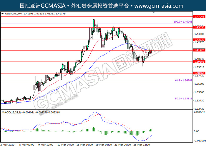 USDCAD,H4:美加低位反弹,目前测试着压力位。MACD多头动能略增,若突破可持续关注多头为主。上方关注1.4175压力和1.4335压力,下方关注1.3990支撑和1.3805支撑。