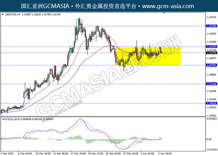 USDCAD,H4:美加仍区间震荡,近期高位承压。然而,由于MACD缺乏动能和方向,建议等更明确的信号出现才进入市场。上方关注1.4260压力和1.4550压力,下方关注1.4000支撑和1.3735支撑。