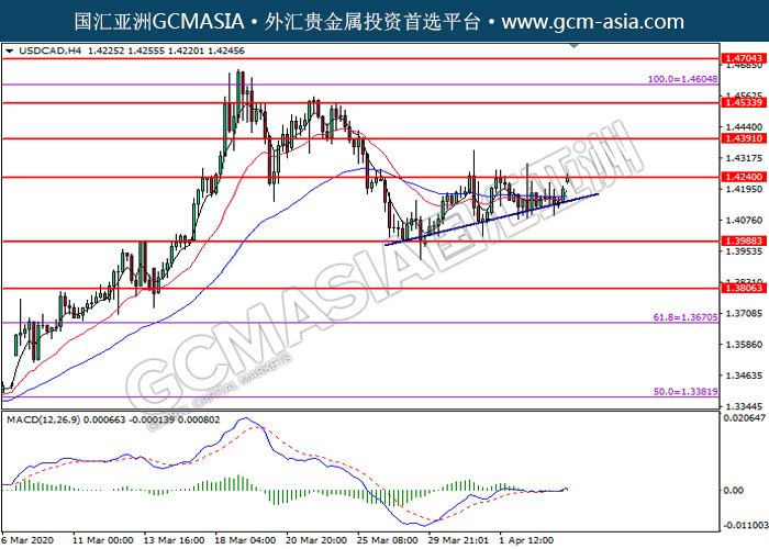 USDCAD,H4:美加触及上升趋势线后反弹,目前测试着压力位。由于MACD并没有显示任何明确信号,建议等到更多信号出现后才进入市场。上方关注1.4240压力和1.4390压力,下方关注1.3990支撑和1.3805支撑。