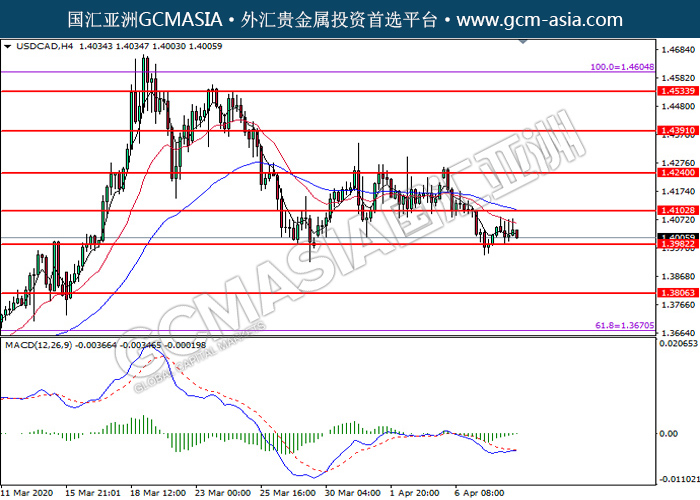 USDCAD,H4:美加触及20均线(红)后回落。然而,MACD显示空头动能略减,短期可关注技术性反弹为主。上方关注1.4105压力和1.4240压力,下方关注1.3980支撑和1.3805支撑。