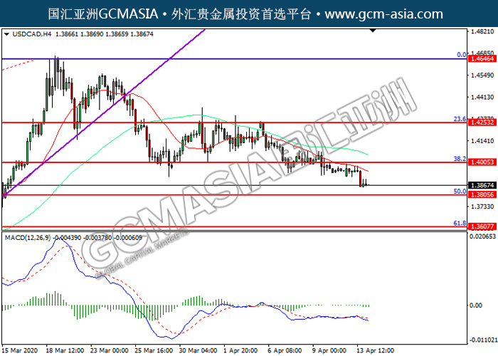 USDCAD,H4:美加突破前期支撑,震荡下行。由于MACD并没有显示任何明确的信号,建议等到更多信号出现后才进入市场。上方关注1.4005压力和1.4255压力,下方关注1.3805支撑和1.3610支撑。