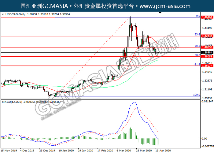 USDCAD,Daily:美加突破前期支撑,震荡下行。然而,MACD空头动能略减,短期可关注技术性回调。上方关注1.4005压力和1.4245压力,下方关注1.3805支撑和1.3610支撑。