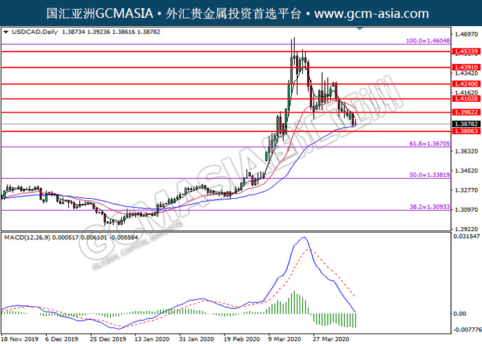 USDCAD,Daily:美加突破后持续下行。MACD显示空头信号,动能略减,短期可持续关注空头走势为主。上方关注1.3980压力和1.4105压力,下方关注1.3805支撑和1.3670支撑。