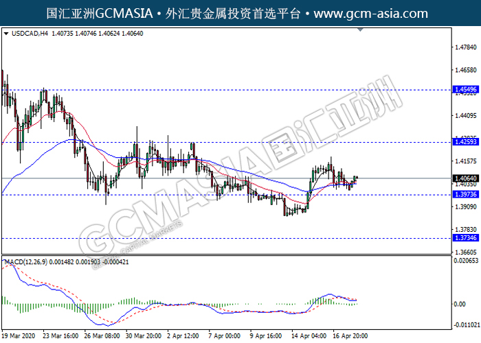 20200420 USDCAD-午间 by keyk | Apr 20, 2020 | 美元兑加元 | 0 comments GCMAsia - USDCAD USDCAD 2020-04-20 USDCAD,H4:美加触底反弹上行。MACD空头动能有所略减,短期继续看多反弹为主。上方关注1.4260压力和1.4450压力,下方关注1.3975支撑和1.3735支撑。