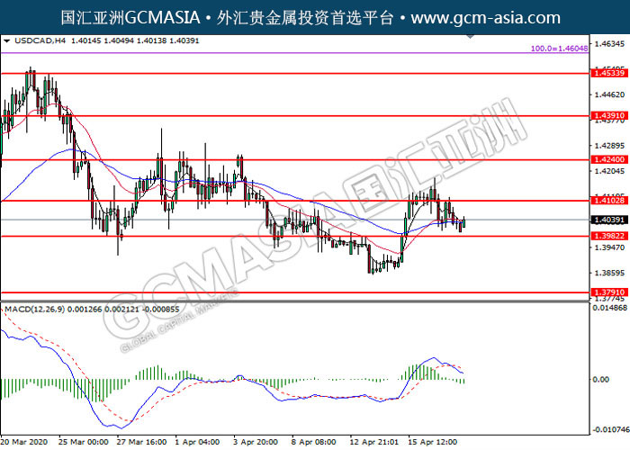 20200420 USDCAD by willy | Apr 20, 2020 | 美元兑加元 | 0 comments GCMAsia - USDCAD USDCAD 2020-04-20 USDCAD,H4:美加地位反弹。MACD显示多头信号,动能略增,短期可关注多头走势为主。上方关注1.4105压力和1.4240压力,下方关注1.3980支撑和1.3790支撑。