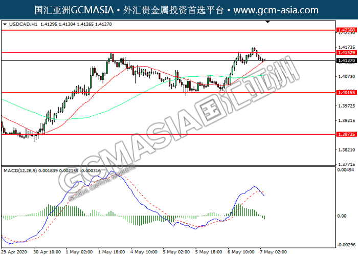 20200507 USDCAD-午间 by keyk | May 7, 2020 | 美元兑加元 | 0 comments GCMAsia - USDCAD USDCAD 2020-05-07 USDCAD,H1:美加震荡下行。MACD空头动能略增,短期可关注空头为主。上方关注1.4155压力和1.4230压力,下方关注1.4015支撑和1.3875支撑。