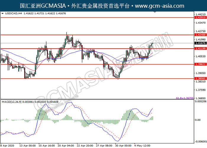 USDCAD,H4:美加突破后持续上行。MACD显示多头信号,动能略增,短期可关注多头走势为主。上方关注1.4240压力和1.4390压力,下方关注1.4120支撑和1.3980支撑。
