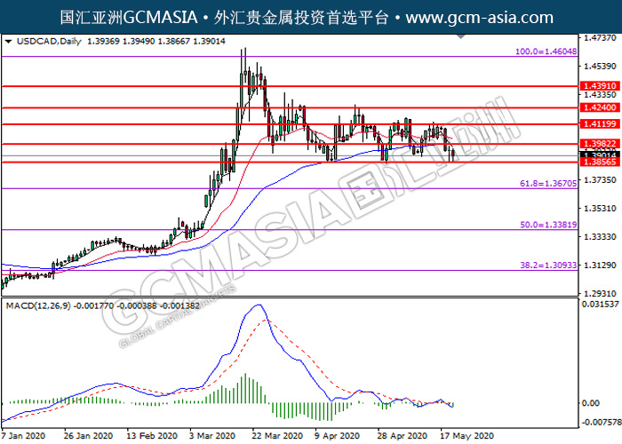 20200521 USDCAD by willy | May 20, 2020 | 美元兑加元 | 0 comments GCMAsia - USDCAD USDCAD 2020-05-21 USDCAD,H4:美加突破后持续下行。MACD显示空头信号,动能略减,短期可关注空头为主。上方关注1.3980压力和1.4120压力,下方关注1.3855支撑和1.3670支撑。
