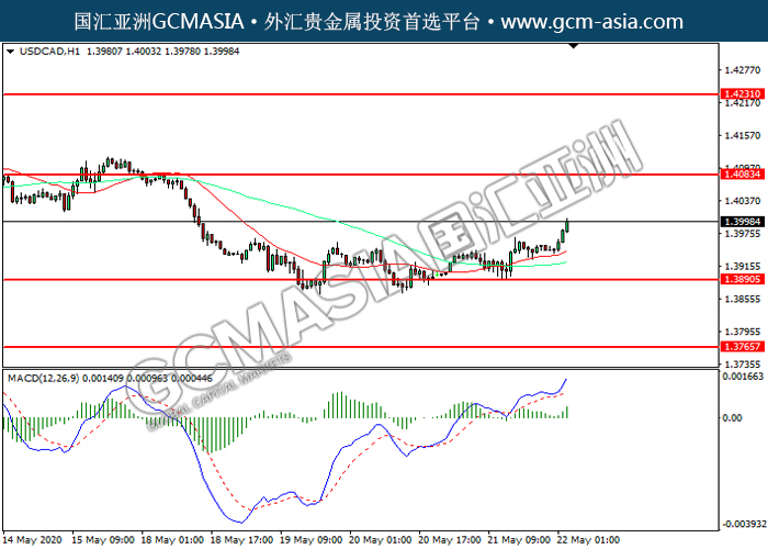 20200522 USDCAD-午间 by keyk | May 22, 2020 | 美元兑加元 | 0 comments GCMAsia - USDCAD USDCAD 2020-05-22 USDCAD,H1:美加触底反弹上行。MACD多头动能略增,短期可继续关注多头反弹为主。上方关注1.4085压力和1.4230压力,下方关注1.3890支撑和1.3765支撑。