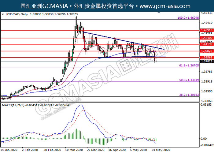 USDCAD,Daily:美加突破后持续下行。MACD显示空头信号,动能略减,短期可关注空头为主。上方关注1.3855压力和1.3980压力,下方关注1.3670支撑1.3380支撑。