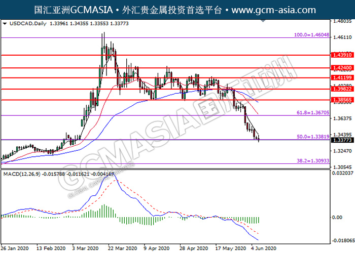 USDCAD,Daily:美加突破后持续下行,目前测试着支撑位。MACD显示空头信号,动能略减,若突破可关注空头走势为主。上方关注1.3670压力和1.3855压力,下方关注1.3380支撑1.3095支撑。