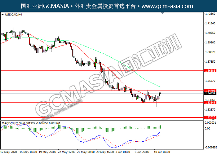 USDCAD,H4:美加低位反弹,目前测试前期压力。MACD显示多头信号,动能略增,短期可关注多头走势为主。上方关注1.3480压力和1.3690压力,下方关注1.3355支撑1.3200支撑。