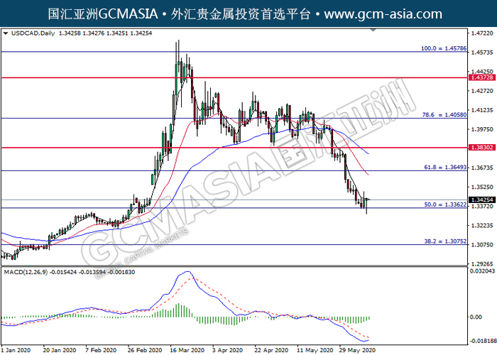 USDCAD,Daily:美加低位反弹。MACD显示多头信号,动能略增,中期可关注多头走势为主。上方关注1.3650压力和1.3830压力,下方关注1.3360支撑1.3075支撑。