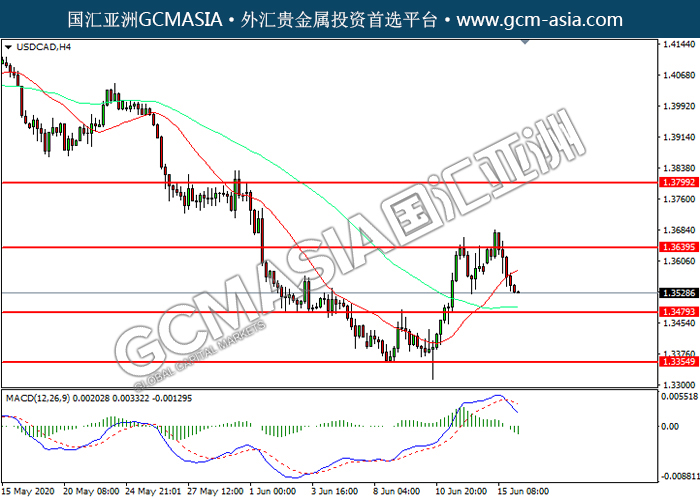 20200616 USDCAD by willy | Jun 16, 2020 | 美元兑加元 | 0 comments GCMAsia-USDCAD USDCAD 2020-06-16 USDCAD,H4:美加震荡下行。MACD已形成死叉,动能转弱,短期可关注空头为主。上方关注1.3640压力和1.3800压力,下方关注1.3480支撑1.3355支撑。