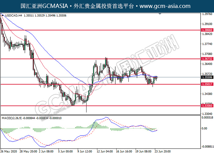 20200624 USDCAD-午间 by keyk | Jun 24, 2020 | 美元兑加元 | 0 comments GCMAsia - USDCAD USDCAD 2020-06-24 USDCAD,H4:美加低位反弹。MACD显示空头动能略减,短期关注多头为主。上方关注1.3675压力和1.3865压力,下方关注1.3500支撑1.3355支撑。