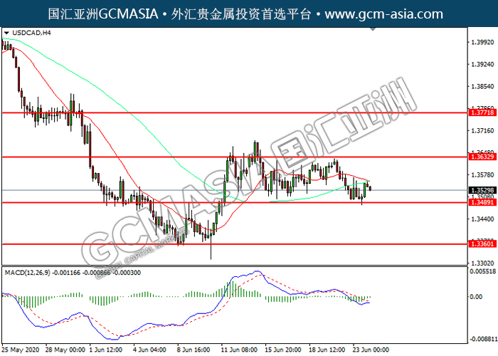 20200624 USDCAD by willy | Jun 24, 2020 | 美元兑加元 | 0 comments GCMAsia-USDCAD USDCAD 2020-06-24 USDCAD,H4:美加低位反弹。MACD空头动能略减,短期可关注多头为主。上方关注1.3635压力和1.3770压力,下方关注1.3490支撑1.3360支撑。