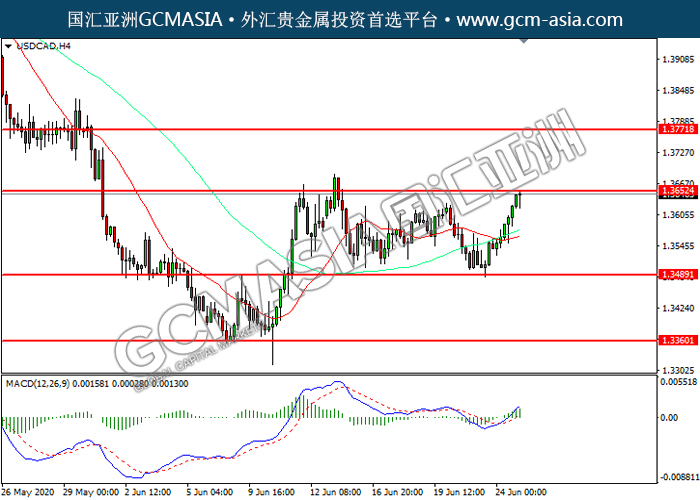 20200625 USDCAD-午间 by keyk | Jun 25, 2020 | 美元兑加元 | 0 comments GCMAsia - USDCAD USDCAD 2020-06-25 USDCAD,H4:美加震荡上行。MACD多头动能略增,若突破可关注多头为主。上方关注1.3650压力和1.3770压力,下方关注1.3490支撑1.3360支撑。