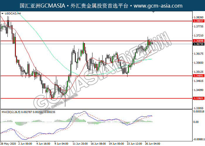 USDCAD,H4:美加震荡上行,目前测试前期压力。然而,MACD显示多头动能略减,短期关注技术性回调为主。上方关注1.3690压力和1.3805压力,下方关注1.3490支撑1.3360支撑。