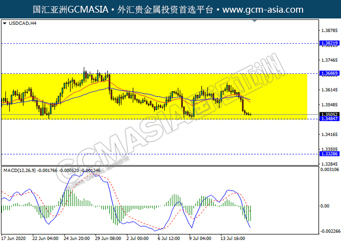 USDCAD,H4:美加仍区间交易,目前测试靠近前期支撑。然而,MACD动能略减,若突破关注空头趋势为主。上方关注1.3685压力和1.3820压力,下方关注1.3485支撑1.3330支撑。