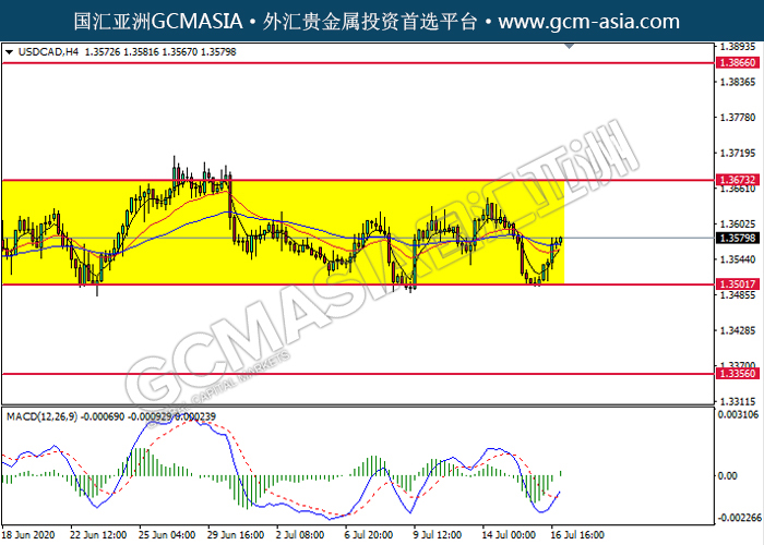 20200717 USDCAD-午间 by keyk | Jul 17, 2020 | 美元兑加元 | 0 comments GCMAsia - USDCAD USDCAD 2020-07-17 USDCAD,Daily:美加低位反弹。MACD显示多头信号,短期关注多头为主。上方关注1.3675压力和1.3865压力,下方关注1.3500支撑1.3355支撑。
