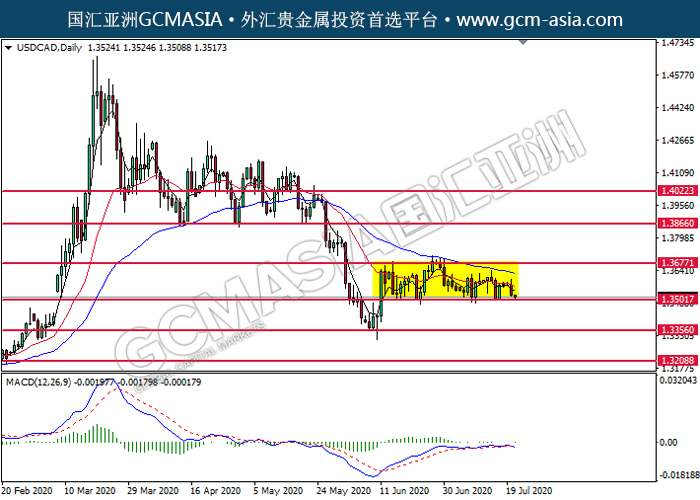USDCAD,Daily:美加高位承压后回落,目前测试着支撑位。MACD显示空头信号,若突破可关注空头为主。上方关注1.3675压力和1.3865压力,下方关注1.3500支撑1.3355支撑。