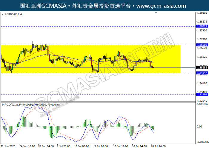 USDCAD,H4:美加仍区间交易,目前测试靠近前期支撑。然而,MACD形成死叉,动能略减,若突破继续看空为主。上方关注1.3685压力和1.3820压力,下方关注1.3485支撑1.3330支撑。