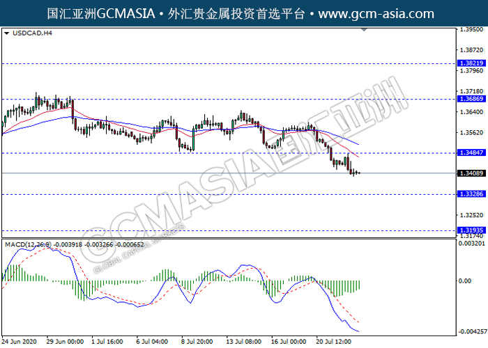 USDCAD,H4:美加突破前期支撑,空头排列。然而,MACD空头动能略减,短期关注技术性多头反弹为主。上方关注1.3485压力和1.3685压力,下方关注1.3330支撑1.3195支撑。
