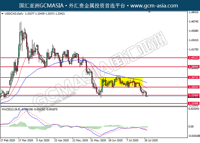 USDCAD,H4:美加突破后持续下行。MACD显示空头信号,动能略减,短期关注空头为主。上方关注1.3355压力和1.3505压力,下方关注1.3210支撑1.3045支撑。