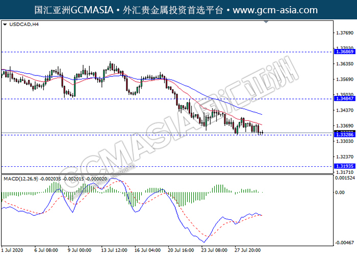 USDCAD,H4:美加震荡下行,目前测试前期支撑。MACD显示空头,多头动能略减,若突破继续看空为主。上方关注1.3485压力和1.3685压力,下方关注1.3330支撑1.3195支撑。