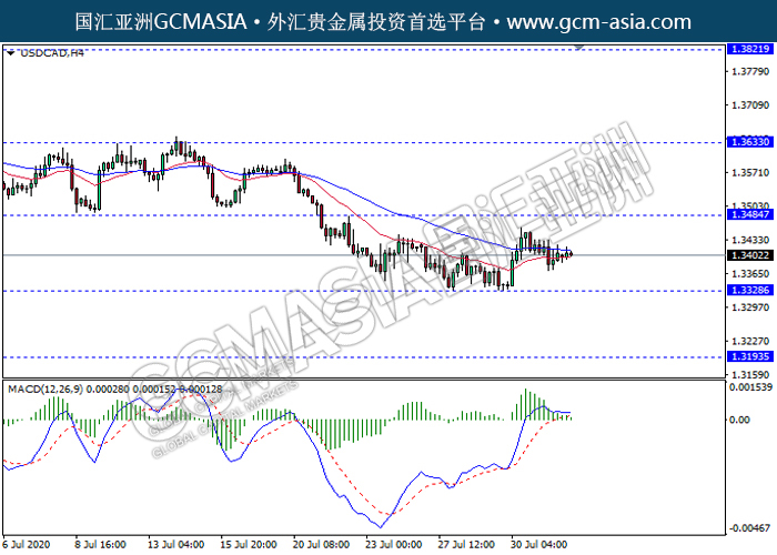 USDCAD,H4:美加震荡盘整靠近前期平均线。然而,MACD显示空头信号,多头动能略减,短期关注空头方向为主。上方关注1.3485压力和1.3635压力,下方关注1.3330支撑1.3195支撑。