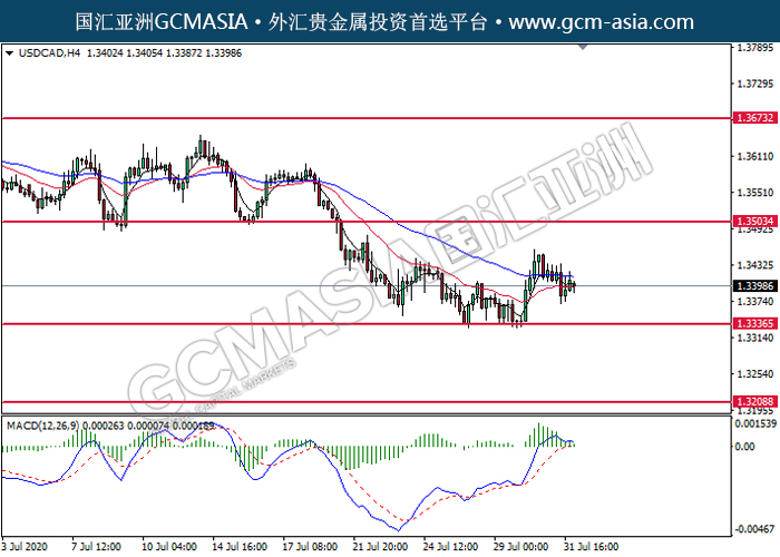 20200803 USDCAD by willy | Aug 3, 2020 | 美元兑加元 | 0 comments GCMAsia-USDCAD USDCAD 2020-08-03 USDCAD,H4:美加高位承压后回落。MACD显示空头信号,动能略减,短期可关注空头为主。上方关注1.3505压力和1.3675压力,下方关注1.3335支撑1.3210支撑。