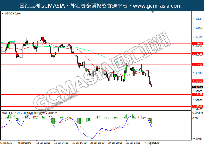 20200805 USDCAD by willy | Aug 5, 2020 | 美元兑加元 | 0 comments GCMAsia-USDCAD USDCAD 2020-08-05 USDCAD,H4:美加突破前期支撑,持续下行。MACD空头动能略增,短期可关注空头为主。上方关注1.3335压力和1.3445压力,下方关注1.3245支撑1.3160支撑。