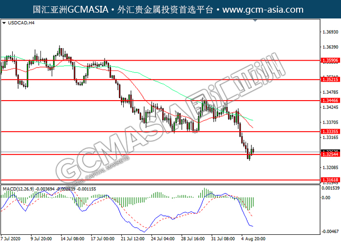 20200806 USDCAD by willy | Aug 6, 2020 | 美元兑加元 | 0 comments GCMAsia-USDCAD USDCAD 2020-08-06 USDCAD,H4:美加低位反弹。MACD空头动能略减,短期可关注多头为主。上方关注1.3335压力和1.3445压力,下方关注1.3255支撑1.3160支撑。