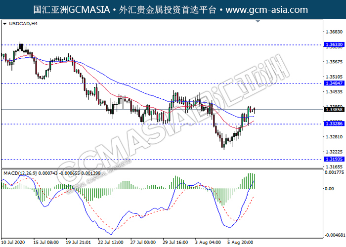 USDCAD,H4:美加突破前期压力,震荡上行。然而,MACD显示空头信号,多头动能略减,短期关注空头方向为主。上方关注1.3485压力和1.3635压力,下方关注1.3330支撑1.3195支撑。