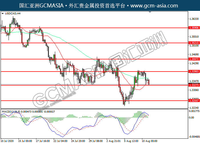 USDCAD,H4:美加高位承压回落,目前测试靠近前期支撑。MACD多头动能略减,若突破关注空头方向为主。上方关注1.3390压力和1.3445压力,下方关注1.3325支撑1.3255支撑。