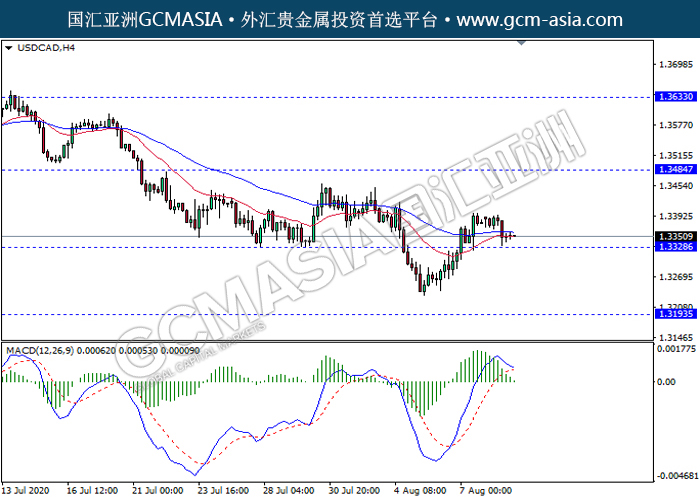 USDCAD,H4:美加高位承压回落,目前测试靠近前期支撑。MACD显示多头,多头动能略减,若突破关注空头方向为主。上方关注1.3484压力和1.3635压力,下方关注1.3330支撑1.3195支撑。