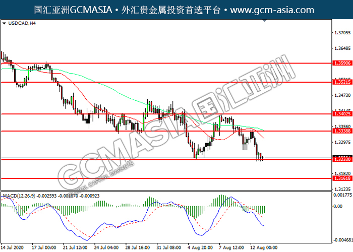 USDCAD,H4:美加震荡下行,目前测试前期支撑。然而,MACD空头动能略减,短期可关注技术性回调为主。上方关注1.3340压力和1.3405压力,下方关注1.3235支撑1.3160支撑。