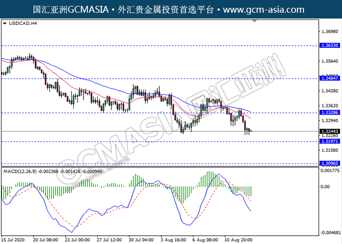 USDCAD,H4:美加震荡下行,目前测试靠近前期支撑。MACD动能持续略减,若突破继续看空为主。上方关注1.3330压力和1.3485压力,下方关注1.3195支撑1.3095支撑。