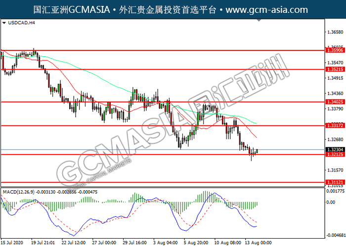 USDCAD,H4:美加高位承压回落,目前测试靠近前期支撑。然而,MACD空头动能略减,短期可关注技术性回调为主。上方关注1.3315压力和1.3405压力,下方关注1.3215支撑1.3110支撑。