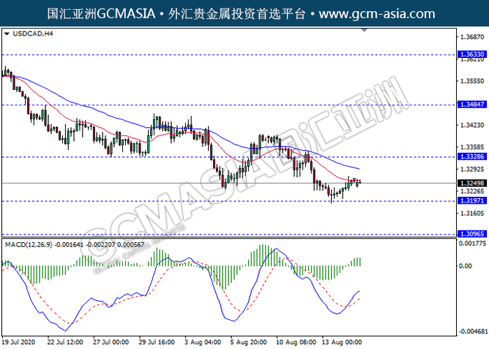 USDCAD,H4:美加近期触底反弹上行。MACD显示多头,动能略增,短期持续关注多头反弹趋势我住。上方关注1.3330压力和1.3485压力,下方关注1.3195支撑1.3095支撑。