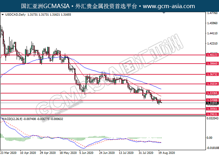 USDCAD,Daily:美加高位承压后回落。MACD显示空头动能偏强,短期可持续关注空头趋势为主。上方关注1.3210压力和1.3335压力,下方关注1.3055支撑1.2955支撑。